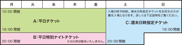 | ※6月末日まで。7月1日〜最終日は「A:平日チケット」および 「当日券」のみでご入場いただきます。