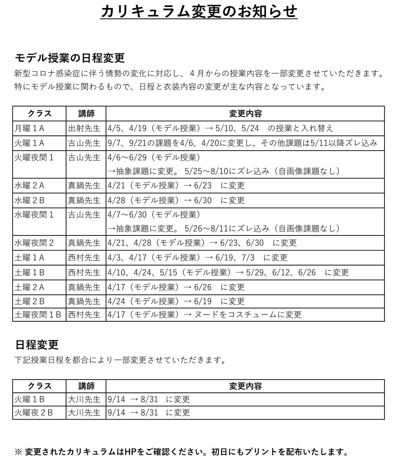 【お知らせ】2021年前期通常講座カリキュラム内容変更