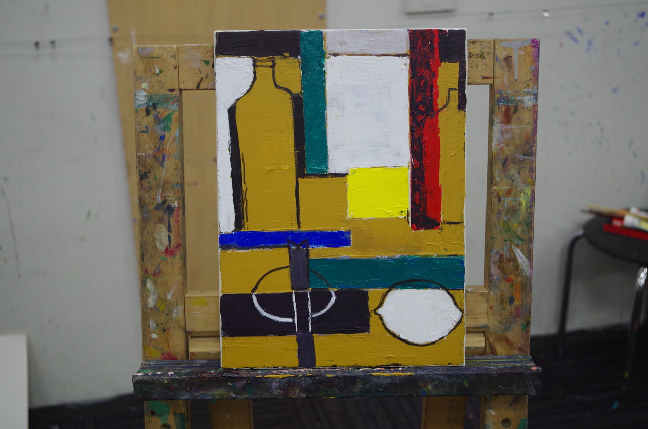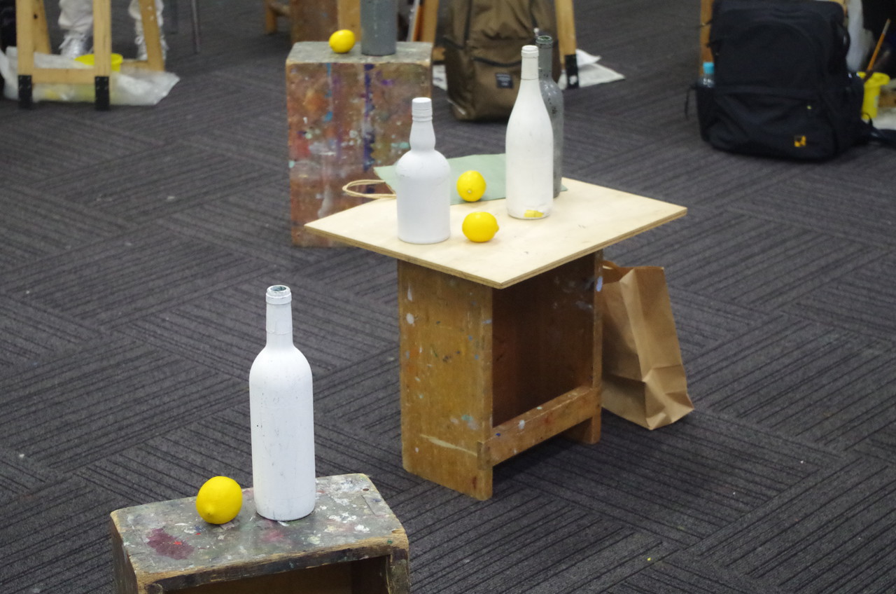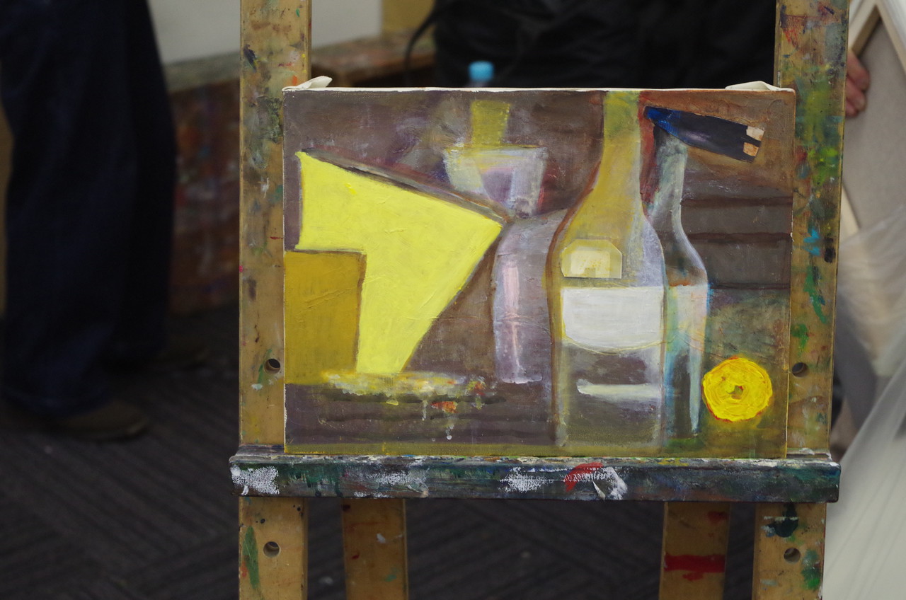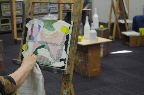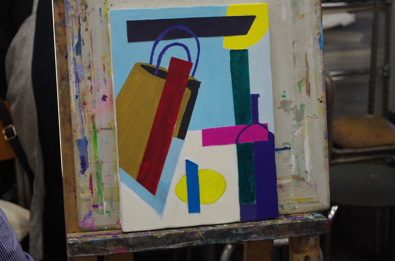 「現代の絵画にはある意味で必要な概念である“プラットホーム(土台)”と、その上に乗せられる“図”の関係に着目する実験的な講座です。強固なプラットホームは独自の形と空間をつくり、それだけで自立するものです。4号のキャンバスに厚紙を切って接着し、抽象のプラットホームをつくります。その上に乗せる静物モチーフの図はプラットホームに干渉せざるを得ません。そのことが、図の形や空間に予想外の拡張性をもたらせるのです。ぜひ新しい画面の立ち上げ方を体験してみてください。」