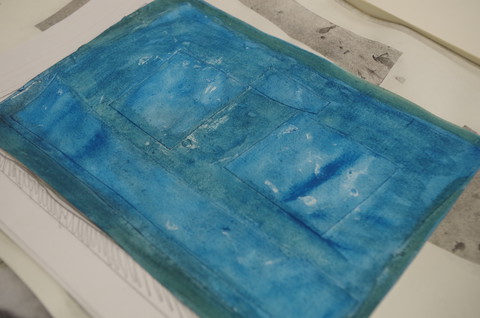 厚紙などの色や凹凸が強力なテクスチャに呼応しながら描いていくこと。