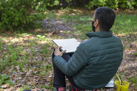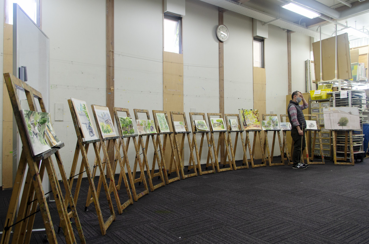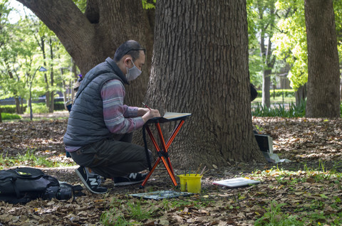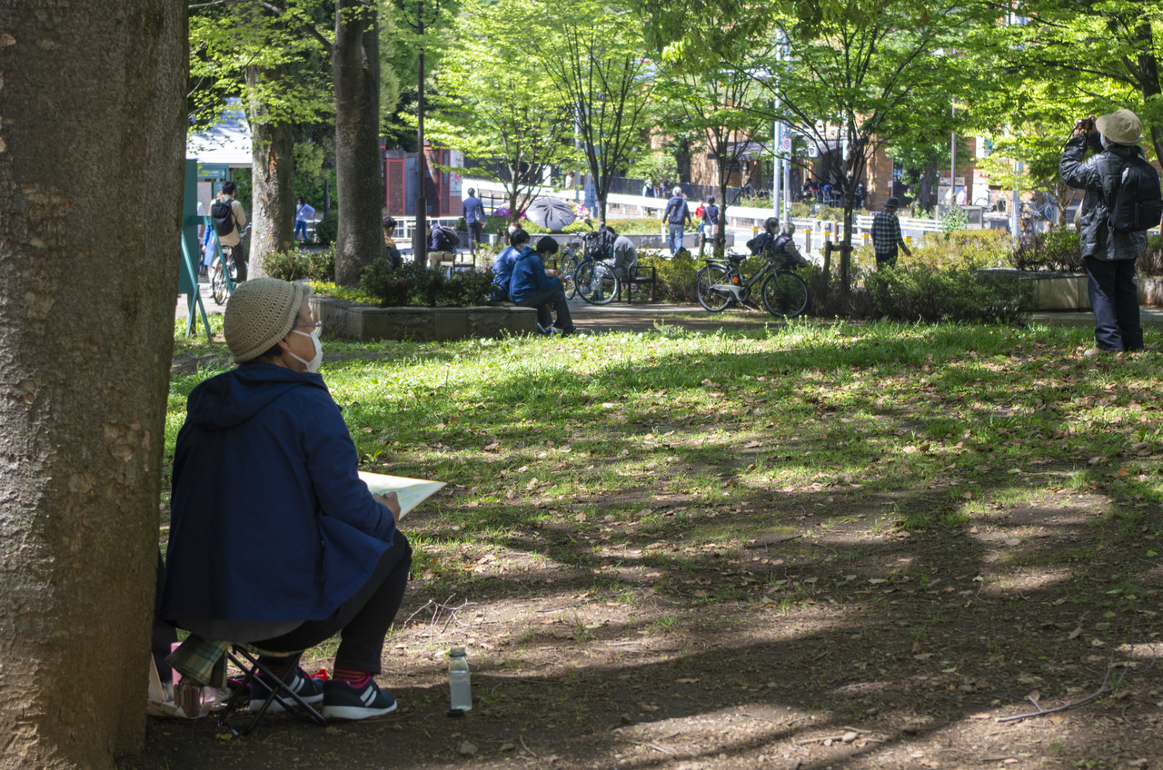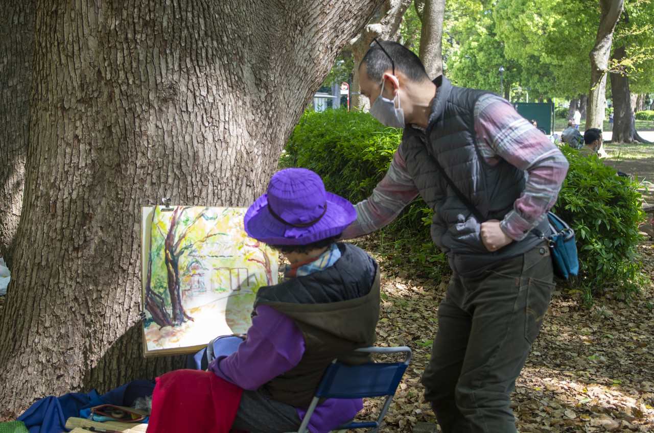 対話をするように、真剣に風景と向き合っている姿は、青々と茂る上野公園の自然と相まって鮮やかに見えます。