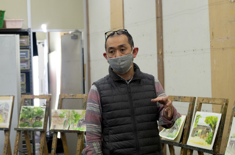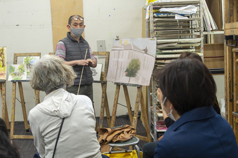 趣のある古い建造物と種類の豊富な樹木を組み合わせて、短い時間の中でモチーフの特徴のどこに焦点を当てていくか、実際の鉛筆の走らせ方、絵の具の置き方を中心に解説するという授業内容です。