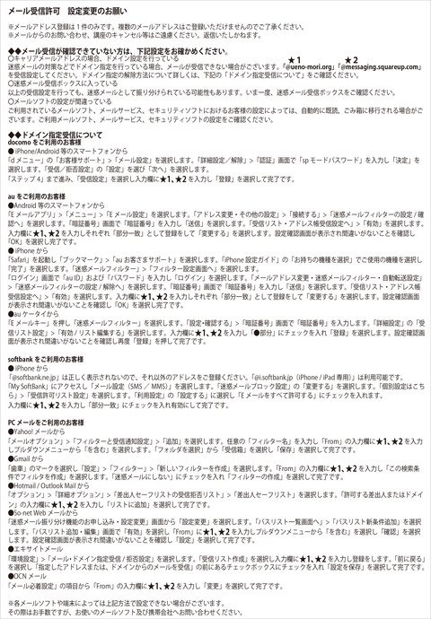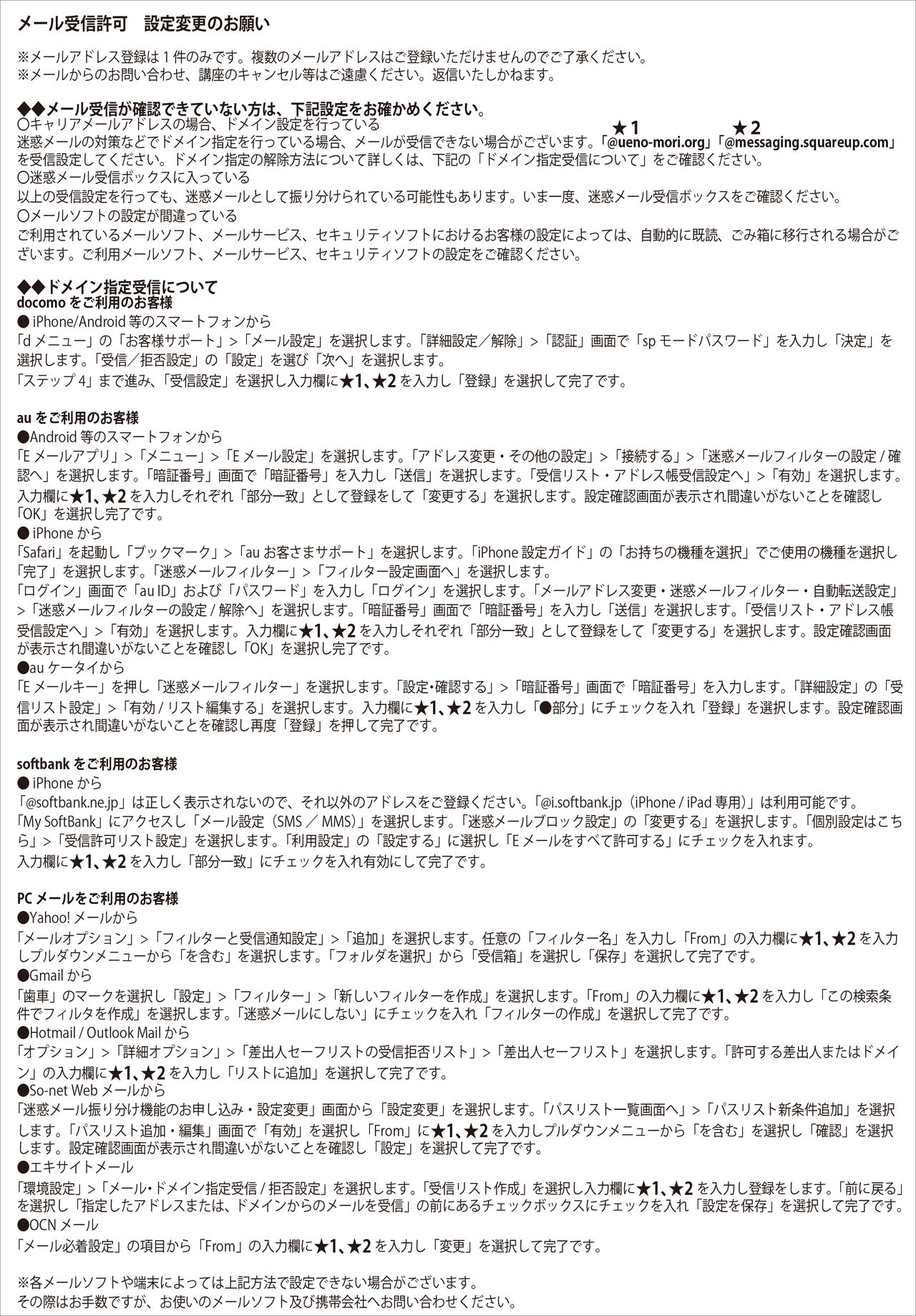 なお、各携帯キャリア(docomo、au、SoftBankなど)のメールアドレスの場合、配信するメールが届かない場合がございます。メールは「@ueno-mori.org」及び「@messaging.squareup.com」を受信可能な状態に設定いただきますようお願いいたします。 ※softbank.ne.jpは正しく表示されないので、それ以外のアドレスをご登録ください。詳しくはメール受信許可設定変更のお願いをご参照ください。