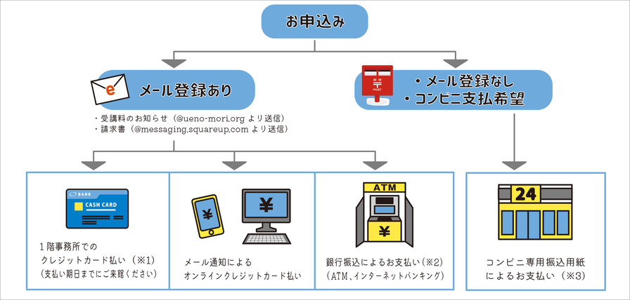 - メール登録がありましてもメールが不達の場合、コンビニ振込用紙でのお支払いをご希望の場合は郵送させていただきます。