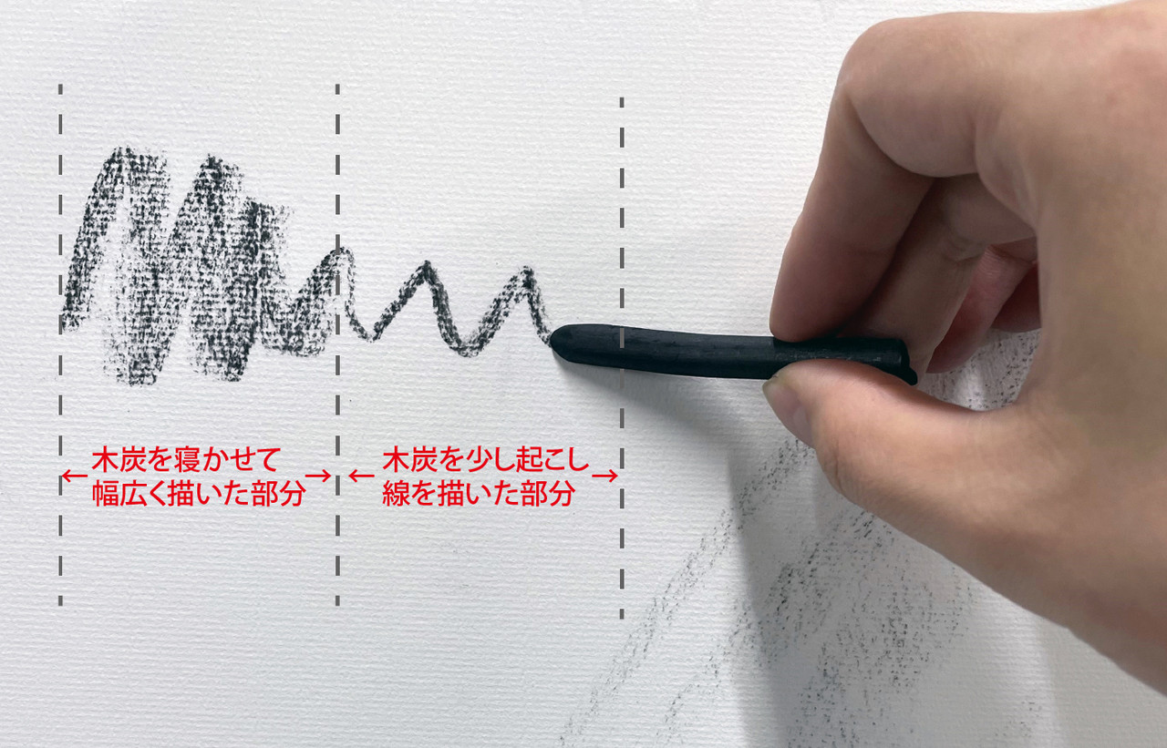 木炭の端を持ち、画面に対して寝かせてあてます。削りだした斜めの部分を画面に滑らせて幅広に描くことで、「面」を描きます。持ち方はそのままで、木炭を少し起こすと「線」が描けます。