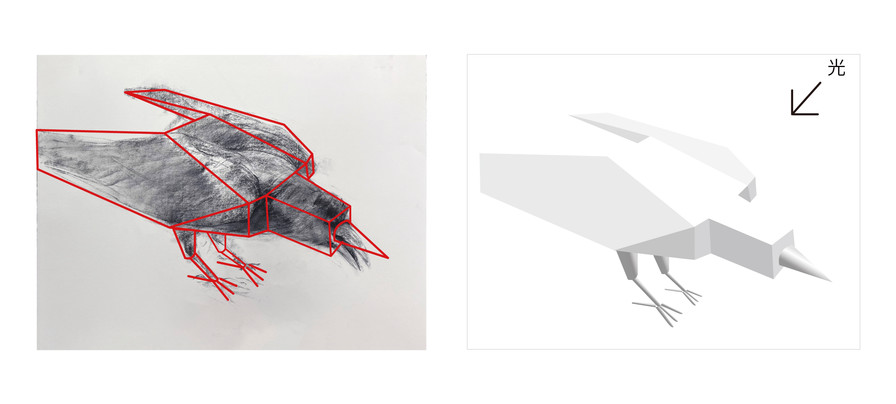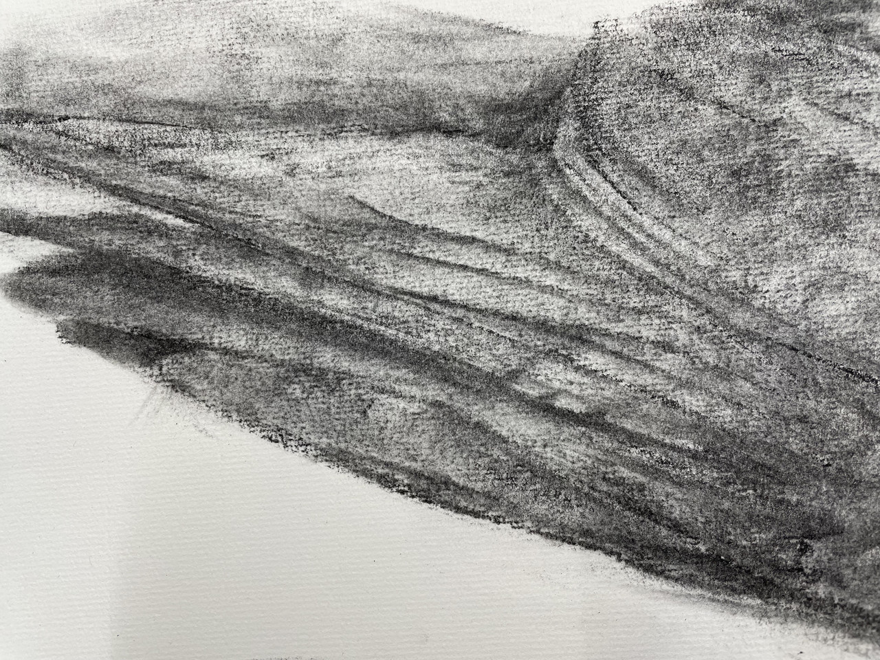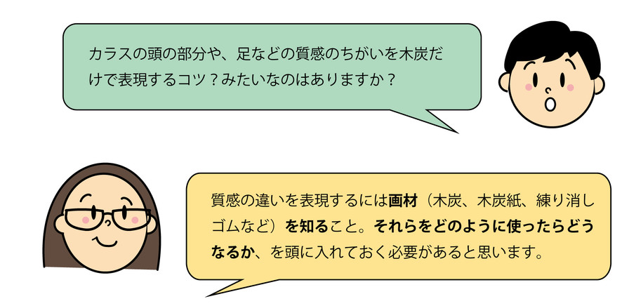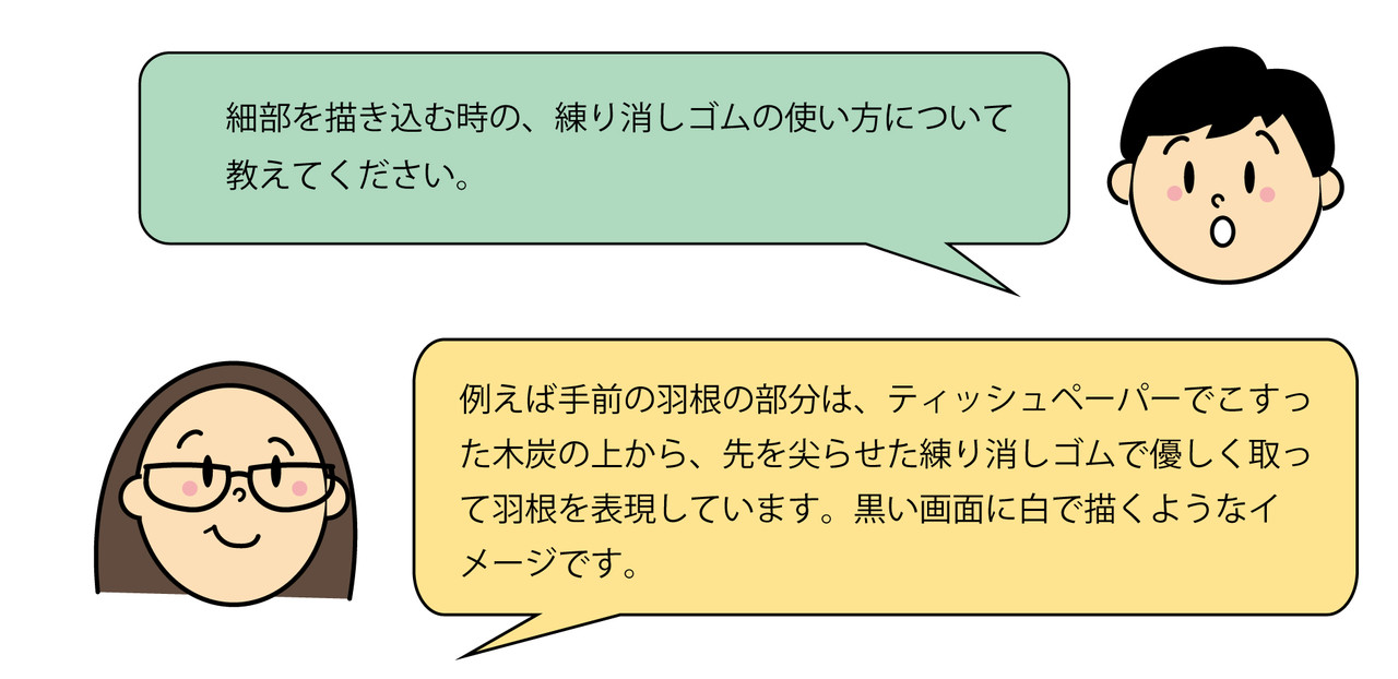ちなみに、上記の手法は「木炭をこうしたらこのように見えるかな?」と試行錯誤しながらのものなので、描き方の正解というものではありません。ご覧になっている方に描き方のヒントになればと思います。
