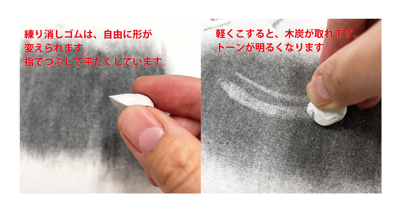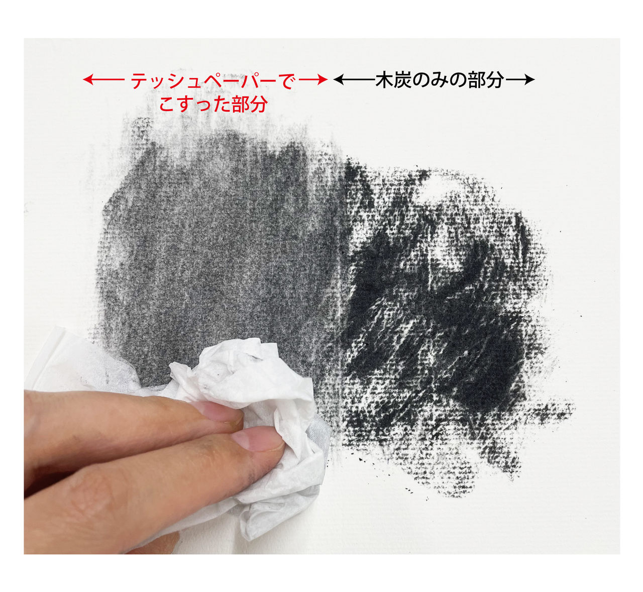 使用画材:MBM木炭紙、木炭、ティッシュペーパー、練り消しゴム、擦筆(さっぴつ)、芯抜き