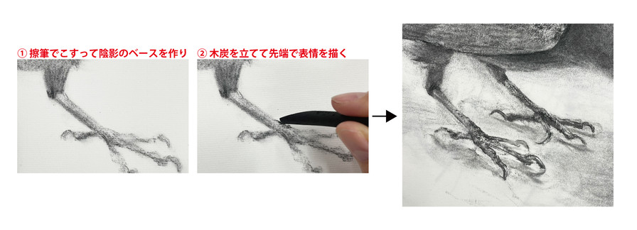 足の部分は、擦筆でこすって陰影のベースを作り、その上から木炭を立てて先端で表情を描きました。