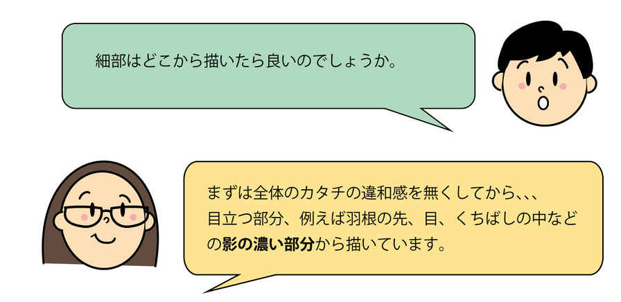 また、ハイライト以外の部分であれば、ティッシュペーパーでこすったりもします。先ほど面で捉えたときの、羽根や首元の光に対して影になる部分をこすっています。