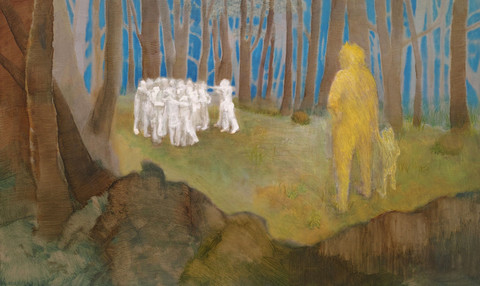 下塗りして画面を眺める事です。絵の具の色ムラを眺め、見えてくる図像をとらえて、私以外の人にも見える程度に描き起こします。私は、自分よりも画面に期待しているところがあります。下地の中に探すと自分でも思いもつかないものが見えてくるからです。へぇ〜と思いながら描いてます。2〜3年くらい画面を眺めています。