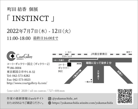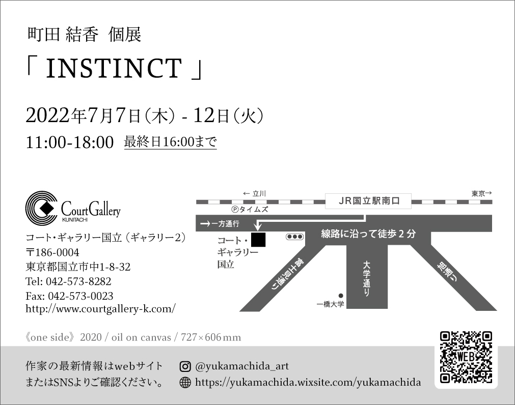 【展覧会情報】町田結香 個展(コート・ギャラリー国立/国立) 2022年6月20日 アートスクール担当、町田結香さんの個展のご案内です。是非ご高覧ください。町田結香 個展INSTINCT会 期:2022年7月7日(木)〜7月12日(火) 時 間:11:00〜18:00 ※最終日16:00まで会 場:コート・ギャラリー国立 〒186-0004 東京都 国立市中1-8-32 TEL. 042-573-8282 コート・ギャラリー国立 webサイト