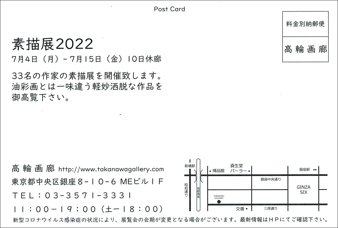 【展覧会情報】遊馬賢一 大見伸 グループ展『素描展2022』(高輪画廊/銀座) 2022年6月23日 講師、遊馬賢一先生と大見伸先生のグループ展のご案内です。是非ご高覧下さい。「素描展2022」会 期:2022年7月4日(月)〜7月15日(金) 時 間:11:00〜19:00 ※土曜日18:00まで、10日休廊会 場:高輪画廊 〒104-0061 東京都中央区銀座8-10-6 MEビル1F TEL. 03-3571-3331 高輪画廊ホームページ