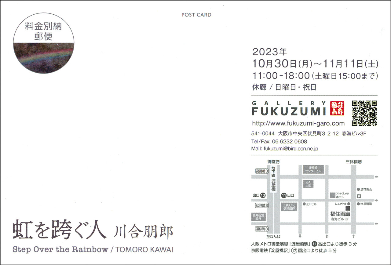 【展覧会情報】川合朋郎 個展 『虹を跨ぐ人』 2023年10月15日 講師の川合朋郎先生の展覧会が開催されますのでご案内いたします。是非ご高覧ください。川合朋郎虹を跨ぐ人会 期:2023年10月30日㈪〜11月11日㈯時 間:11:00〜18:00 (土曜日は15:00まで)会 場:福住画廊 〒541-0044 大阪市中央区伏見町3-2-12 春海ビル3FTEL:06-6232-0608 福住画廊