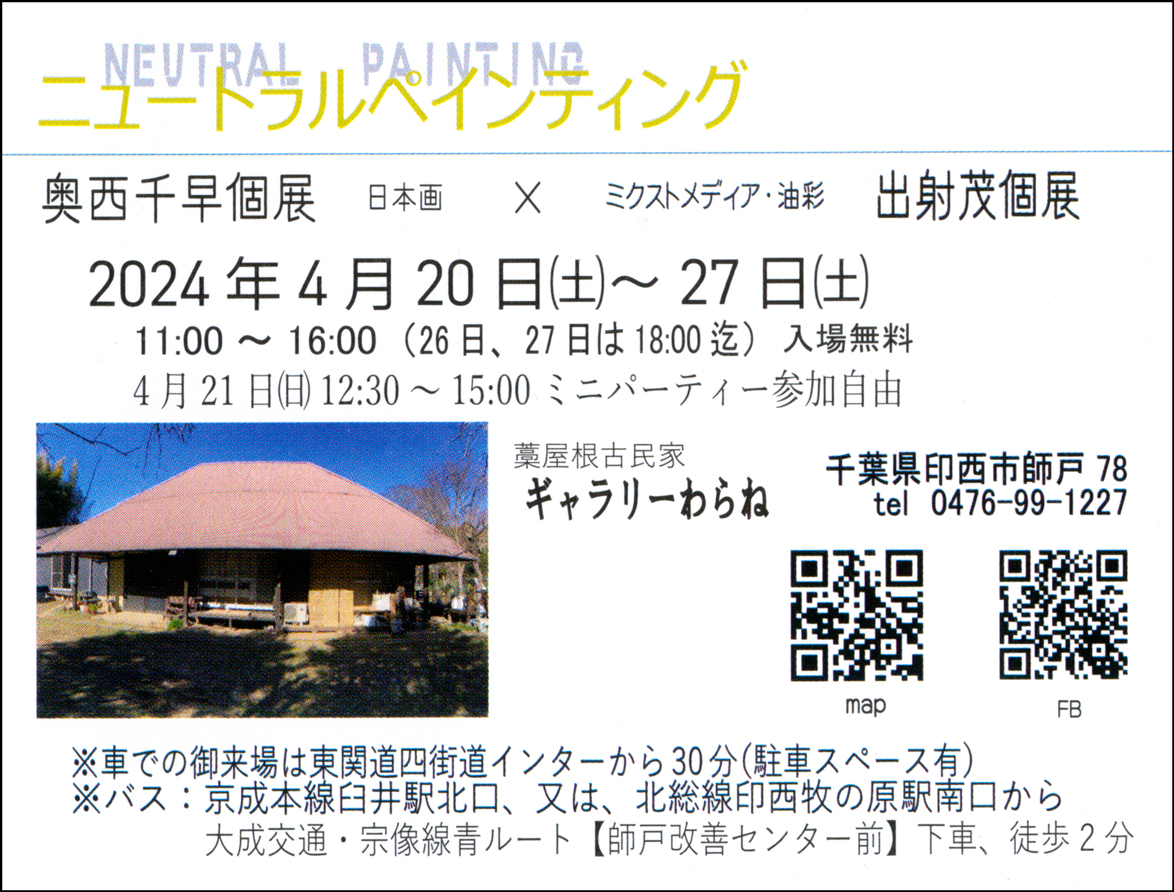 【展覧会情報】奥西千早 個展 × 出射茂 個展『ニュートラルペインティング』(ギャラリーわらね/印旛, 千葉)