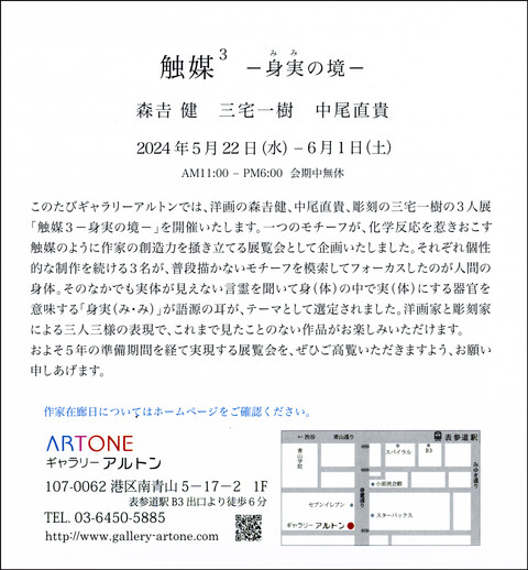 【展覧会情報】中尾直貴 グループ展『触媒3 ―身実の境―』(ギャラリーアルトン/南青山) 2024年4月27日 講師の中尾先生が出品される展覧会をご案内致します。是非ご高覧下さい。触媒3 ―身実(みみ)の境―会 期:2024年5月22日㈬~6月1日㈯時 間:11:00~18:00 会期中無休会 場:ギャラリーアルトン 〒107-0062 東京都港区南青山5-17-2 1FTEL:03-6450-5885 ギャラリーアルトン