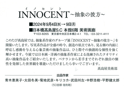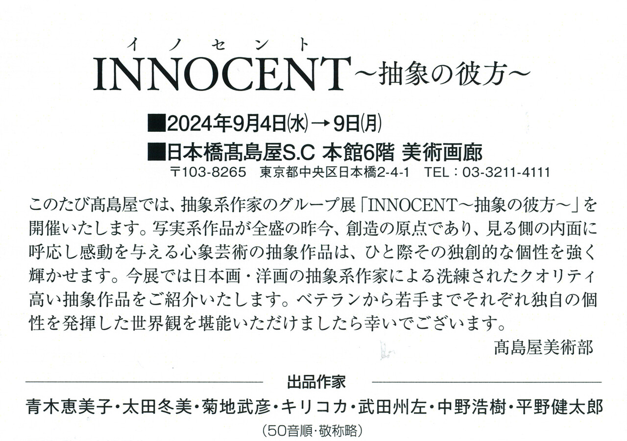 【展覧会情報】平野健太郎 グループ展『INNOCENT ~抽象の彼方~』(日本橋高島屋S.C 美術画廊/日本橋)