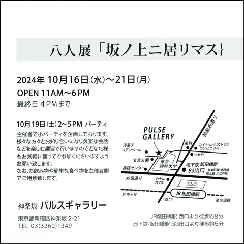 【展覧会情報】今井陽子 グループ展「坂ノ上ニ居リマス}(神楽坂パルスギャラリー/神楽坂)