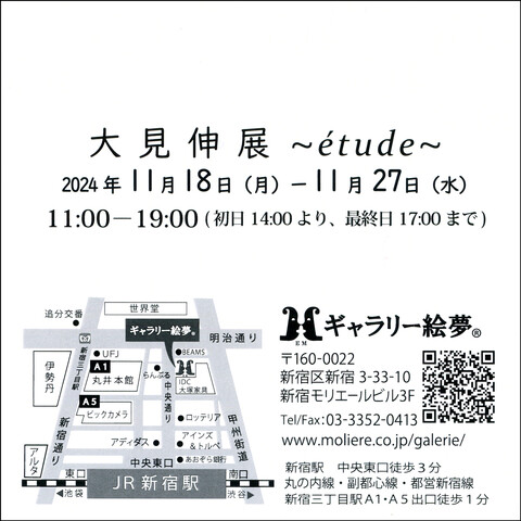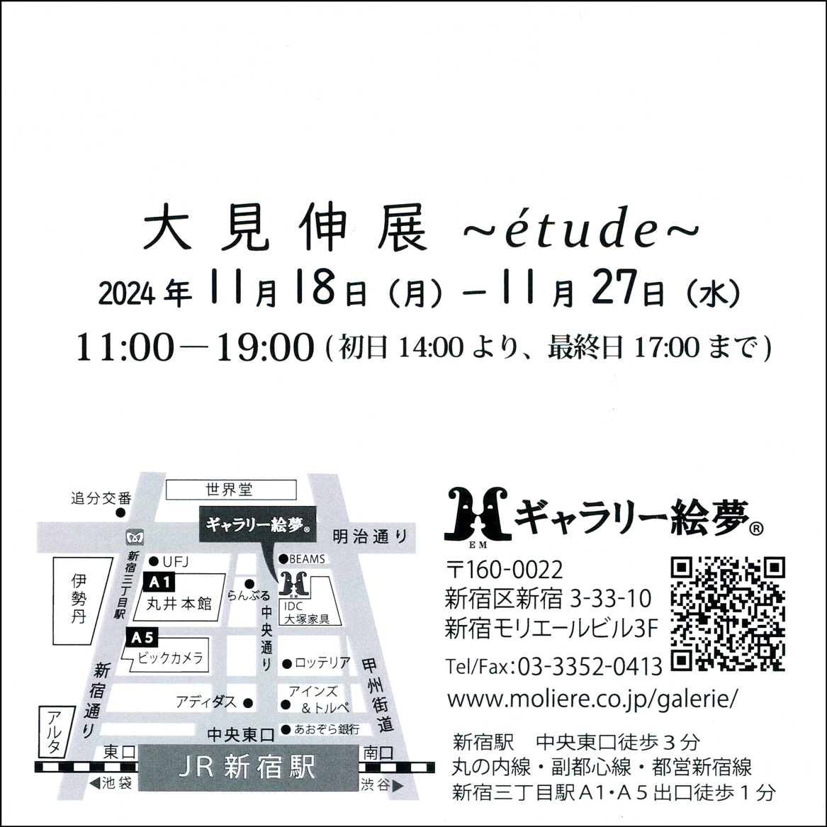 【展覧会情報】大見伸 個展 ~étude~(ギャラリー絵夢/新宿) 2024年10月15日 講師の大見伸先生の個展が開催されます。是非ご高覧ください。大見伸 展 ~étude~会期:2024年11月18日㈪〜11月27日㈬時間:10:00~19:00(初日14:00より、最終日は17:00まで)会場:ギャラリー絵夢 〒160-0022 新宿区新宿3-33-10 新宿モリエールビル3F Tel./Fax. 03-3352-0413 ギャラリー絵夢