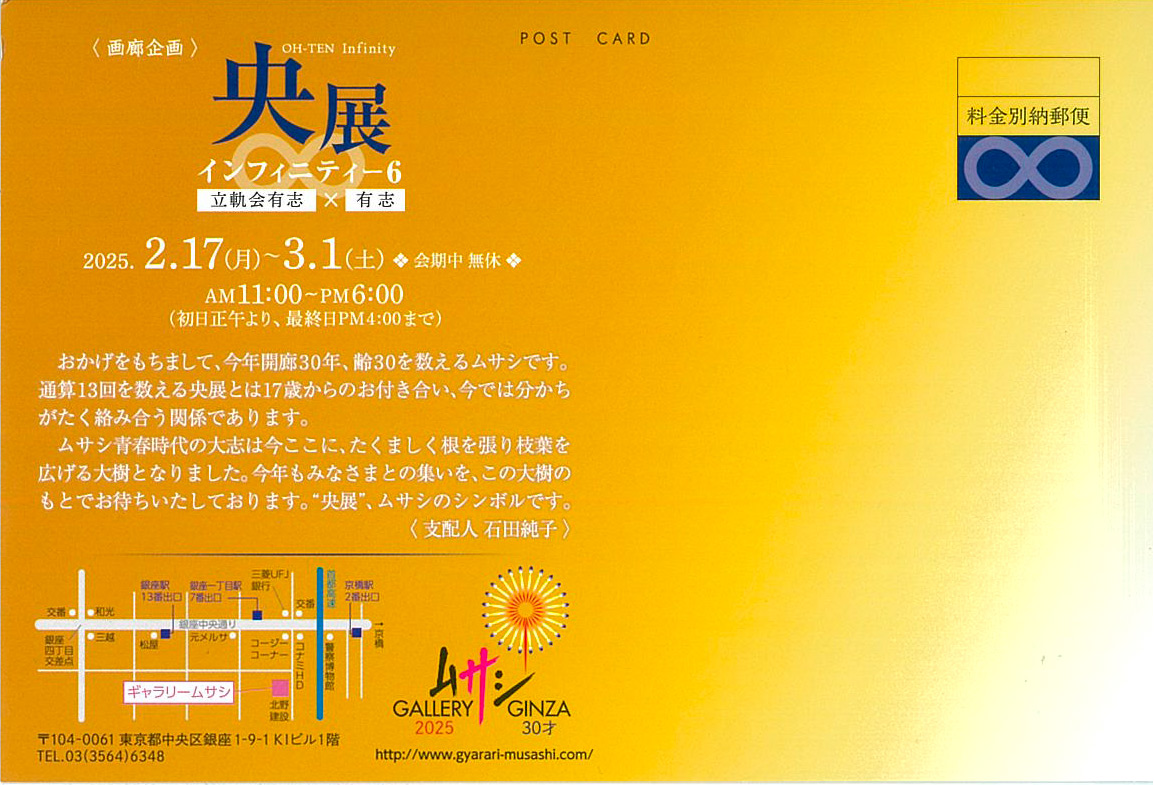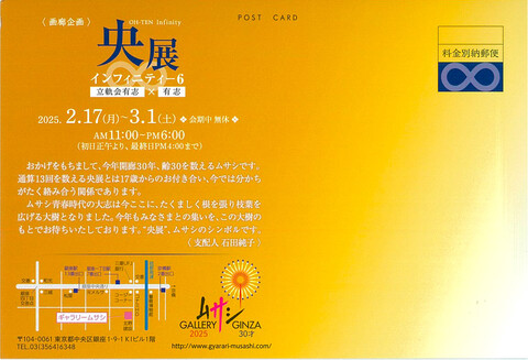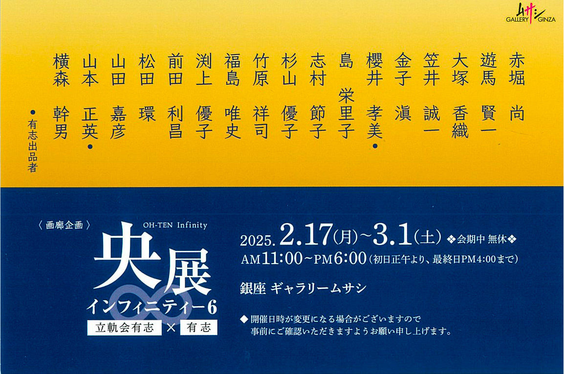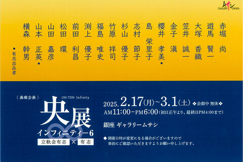 【展覧会情報】遊馬賢一 立軌会有志×有志『央展 ∞ インフィニティー6』(ギャラリームサシ/銀座) 2月10日 講師の遊馬賢一先生が参加されますグループ展のご案内です。ぜひご高覧ください。立軌会有志×有志央展∞ インフィニティー 6会期:2025年2月17日(月)〜3月1日(土)時間:11:00〜18:00(初日は正午より)(最終日は16:00まで)会期中無休会場:銀座 ギャラリームサシ 〒104-0061 東京都中央区銀座1-9-1 KIビル1階TEL.:0335646348 ギャラリームサシ