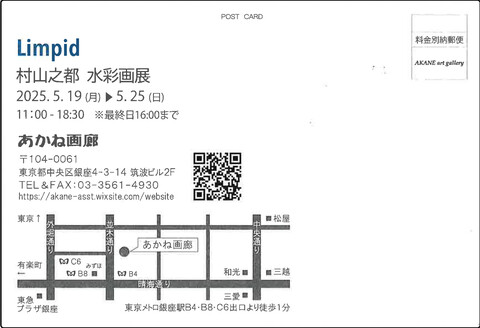 【展覧会情報】村山之都 水彩画展「Limpid」(あかね画廊/銀座) 4月28日 講師、村山之都先生による個展のご案内です。是非ご高覧ください。村山之都 水彩画展Limpid会 期:2025年5月19日(月)~5月25日(日)時 間:11:00〜18:30 (最終日は16:00まで)会 場:あかね画廊 〒104-0061 東京都中央区銀座4-3-14 筑波ビル2F Tel:03‐3561‐4930