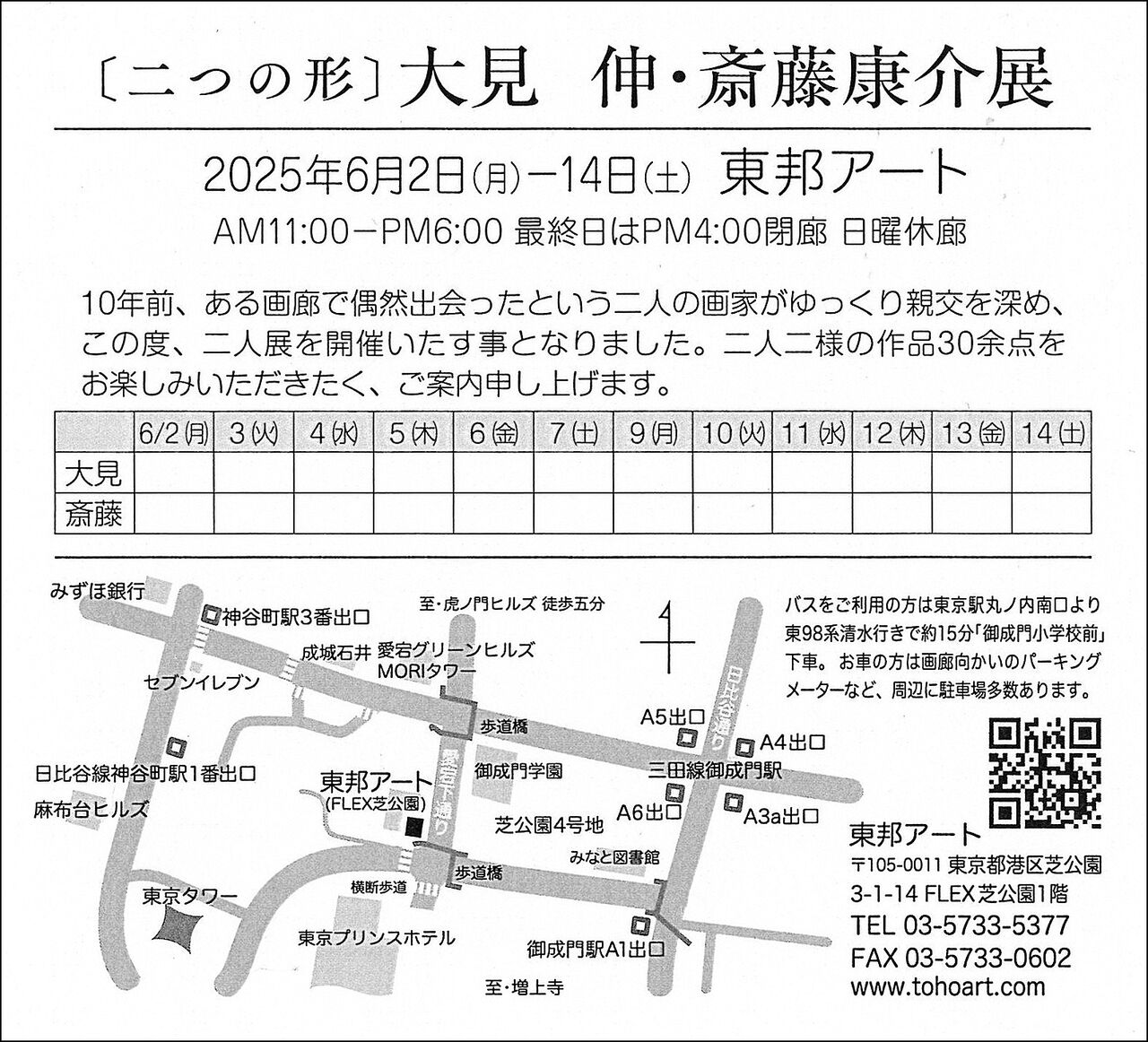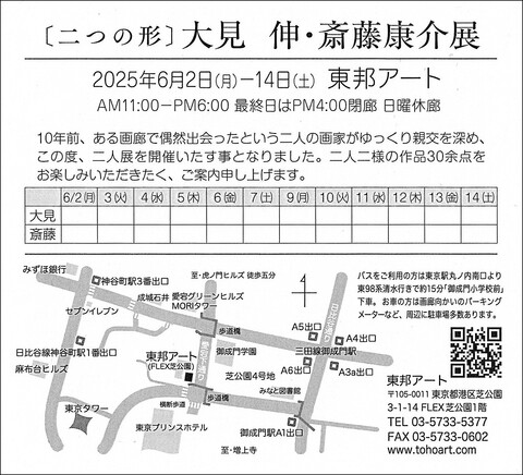 【展覧会情報】大見伸 二人展『〔二つの形〕大見 伸・斎藤康介展』(東邦アート/東京 芝) 5月16日 講師の大見伸先生が出品される展覧会をご案内致します。是非ご高覧下さい。〔二つの形〕大見 伸・斎藤康介展会 期:2025年6月2日㈪~6月14日㈯時 間:11:00~18:00(最終日は16時まで, 日曜休廊)会 場:東邦アート 〒105-0011 東京都港区芝公園3-1-14 FLEX芝公園1階 TEL 03-5733-5377 FAX 03-5733-0602 東邦アート