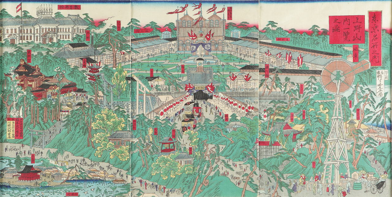 なお本展第5章で紹介される、河鍋暁斎《東京名所之内 上野山内一覧之図》は、当スクール開催の2025夏季・特別講座・イベント8月20日開催「暁斎に学ぶ―明治以前の空間構成法―」(今井陽子先生)のテーマとなっております。暁斎独自の空間構成について学ぶ講座です。