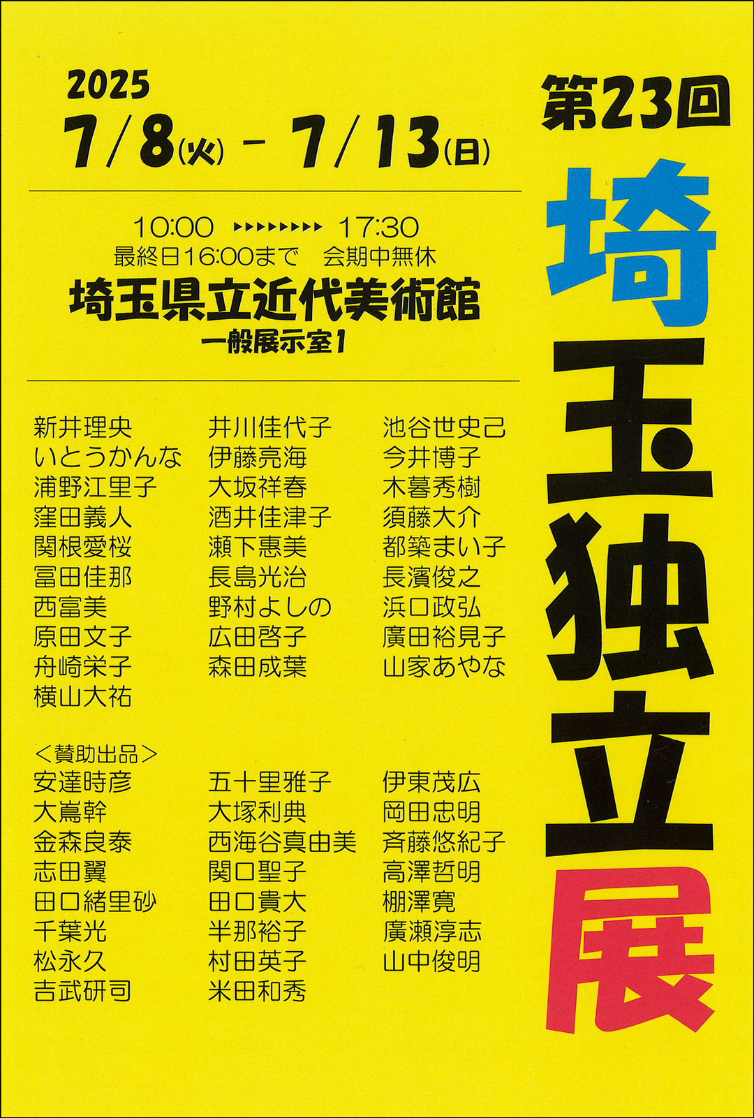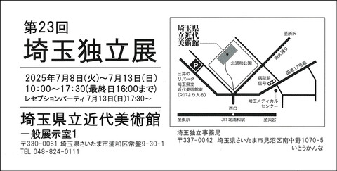 【展覧会情報】伊東茂広 グループ展「第23回 埼玉独立展」(埼玉県立近代美術館/浦和) 7月3日 講師、伊東茂広先生が出品される展覧会をご案内いたします。ぜひご高覧ください。第23回 埼玉独立展会期:2025年7月8日(火)〜7月13日(日)時間:10:00〜17:30(最終日16:00まで)会場:埼玉県立近代美術館 一般展示室1 〒330-0061 埼玉県さいたま市浦和区常盤9-30-1 Tel 048-824-0111 埼玉県立近代美術館