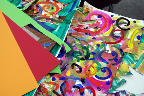色紙、英字新聞、千代紙、包装紙などをみなさんお持ちになってました。講師の指導により自作の紙も授業中に制作しました。その際もモチーフは考慮せず自由に描きます。