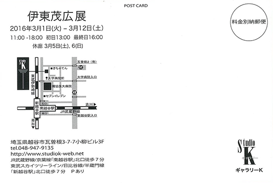 会期:2016年3月1日(火)~12日(土)11:00~18:00(初日13:00より、最終日16:00迄)※休廊3/5,3/6