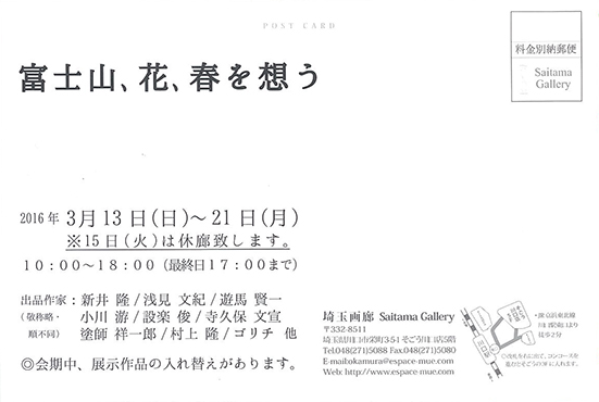 会期:2016年3月13日(日)~21日(月)10:00~18:00(最終日17:00迄)※15日休廊