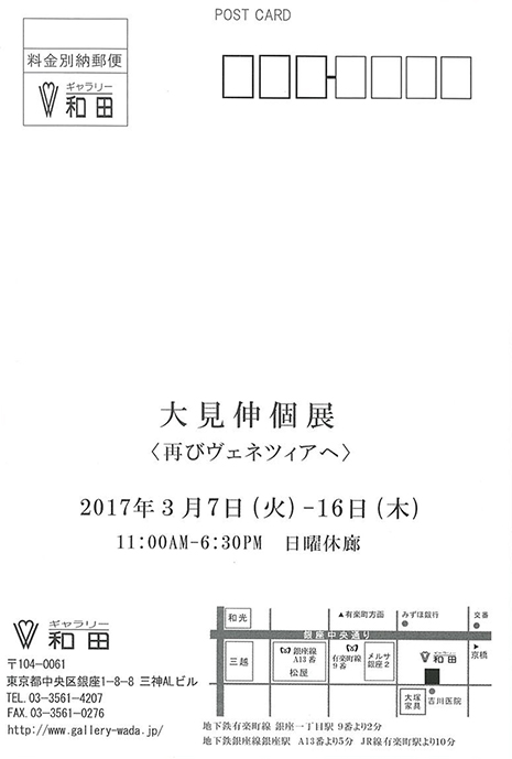 【展覧会情報】大見伸 個展 2017年3月3日 講師の大見伸先生の個展が開催されます。是非ご高覧下さい。■大見伸個展〈再びヴェネツィアへ〉2017年3月7日(火)〜16日(木)am.11:00〜pm.6:30 ※日曜休廊会場「ギャラリー和田」〒104-0061 中央区銀座1-8-8 三神ALビルtel.03-3561-4207 fax.03-3561-0276http://www.gallery-wada.jp/