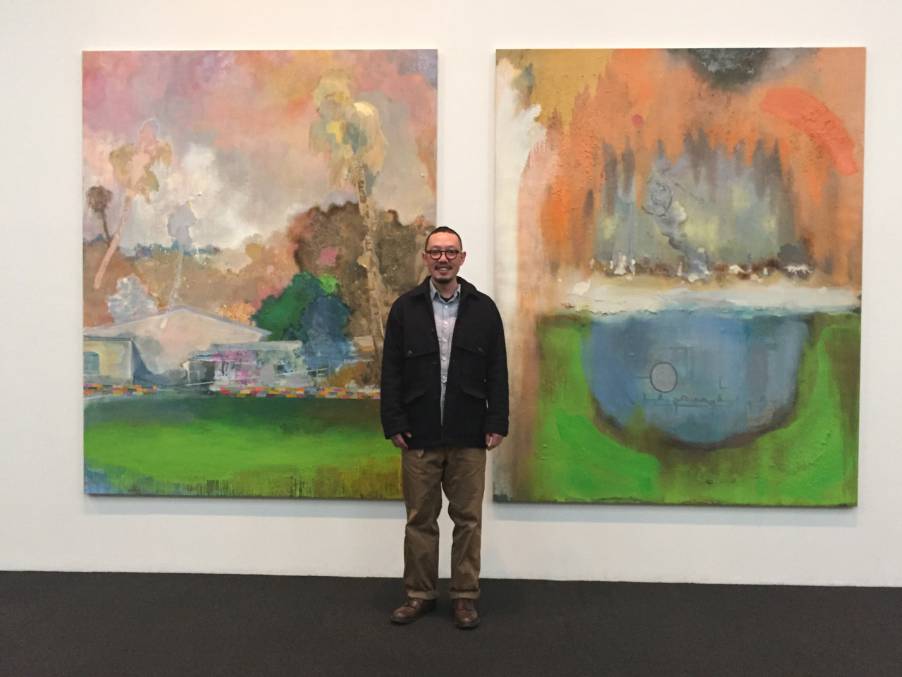 向かって左の作品「家のある風景」、向かって右の作品「夜にみる風景」(素材:油彩、カンバス 227×181cmが2枚)