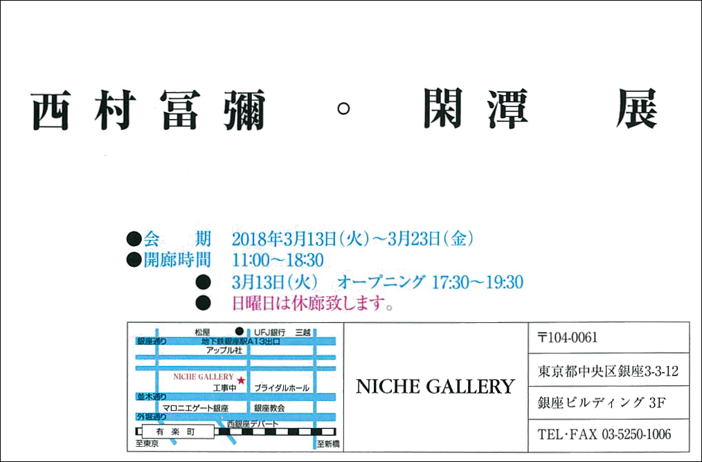 【展覧会情報】西村冨彌 「西村冨彌・閑潭 展」(NICHE GALLERY/銀座) 2018年3月13日 講師、西村冨彌先生の展覧会が開催されますのでご案内致します。是非ご高覧ください。「西村冨彌・閑潭 展」会期:2018年3月13日(火)〜3月23日(金)※日曜休廊 11:00〜18:30 会場:NICHE GALLERY 〒104-0061 東京都中央区銀座3-3-12 銀座ビルディング3階Tel/Fax:03-5250-1006 NICHE GALLERY