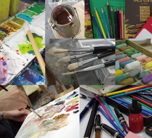 この講座は、油彩やアクリル、水彩、パステル、などなど、たくさんの画材をご用意します。それを、まずはさわってみたり、試したりできる初心者におすすめの講座です。