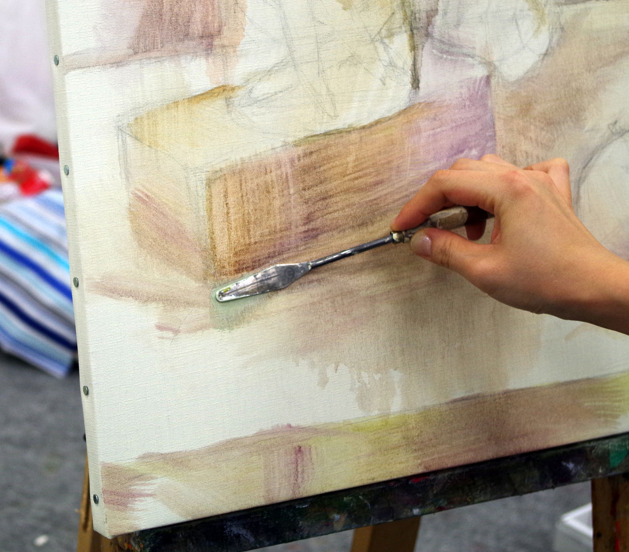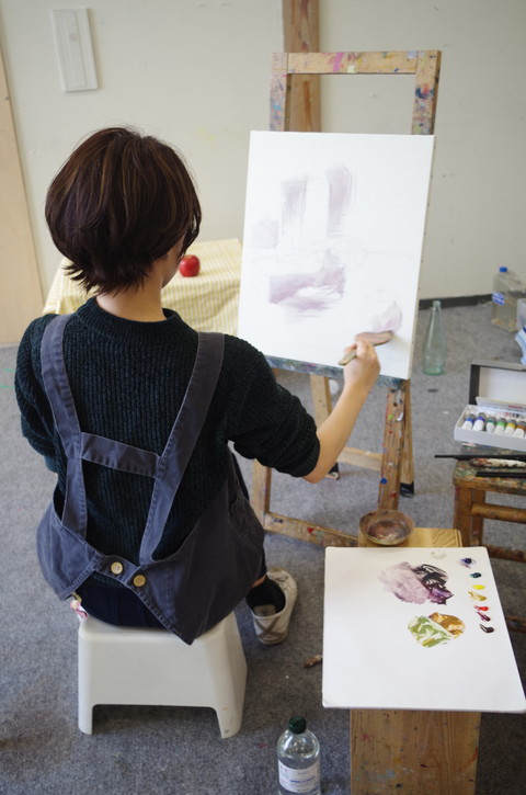 講師の今井陽子先生は、絵画初心者向けの授業を多く受け持ち、熱心な指導で講評の先生です。筆や紙の選び方から、絵具やオイルの使い方、ぼかしやにじみなどの細かなテクニックまで懇切丁寧にお伝えします。