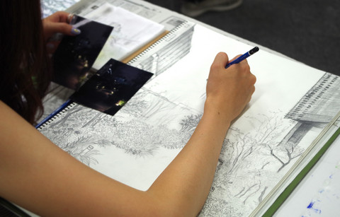 通常クラスの授業風景。水彩で色を付けた下絵です。