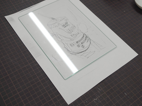 コピーした下絵をガラスにテープで仮止めをして、いよいよ本制作です。