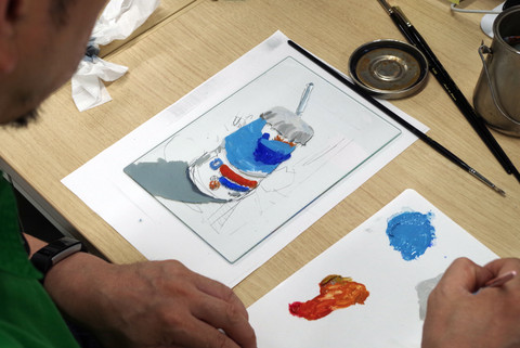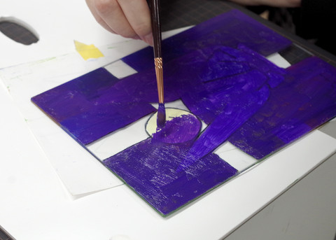 ガラスと同じ大きさの紙に鉛筆で下描きをしてから、水彩やパステル、アクリルなどで色を付けていきます。下絵はしっかりと作っておいた方が良いので、午前中いっぱいを下絵の作成に当てます。