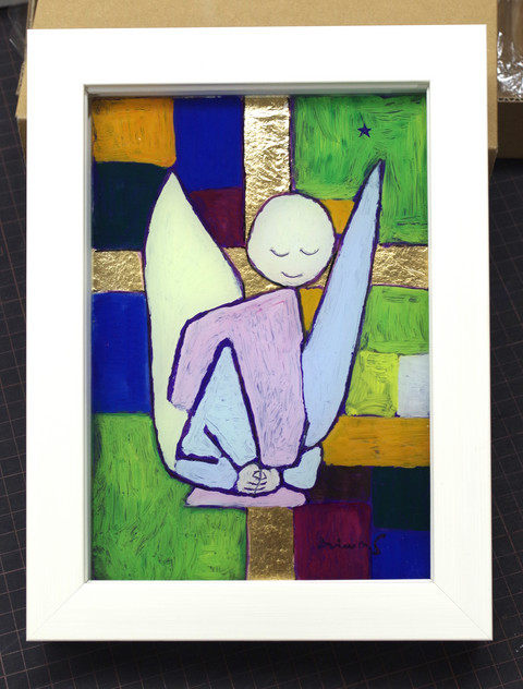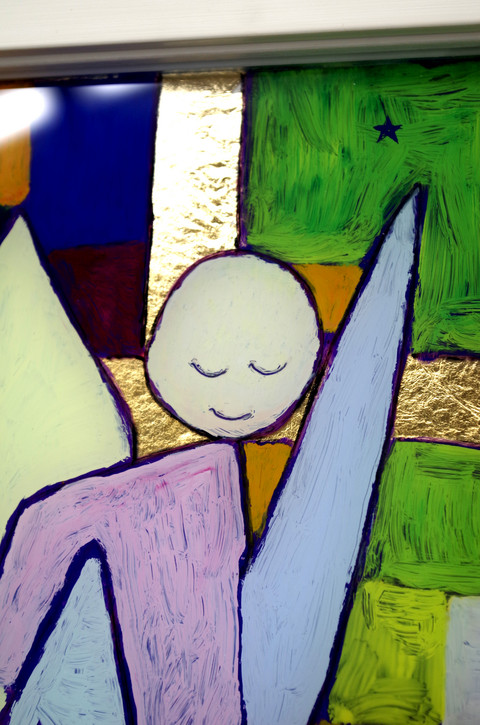 パウルクレーの作品を取り入れて作られたガラス絵です。金色の光っている部分は金箔です。凸凹した紙に金箔を貼ったものをガラスの後ろからあてています。そのことにより、金箔に陰影が付き微かな空間が生まれます。こってりとした絵の具と金箔の軽やかさが響き合い、面白い作品になりました。箔はガラスに直接も貼ることも可能で、直接貼るとピタッとした平滑な金箔になり、それもまた金箔の美しさを際立たせます。作品によって工夫されると良いでしょう。