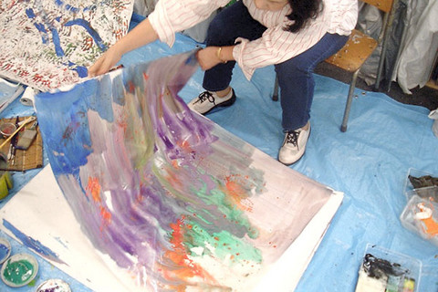 絵画には様々な描き方があります。抽象画というと「難しい、わからない」という印象があるかと思いますが、まずは難しく考えずにリラックスして抽象画を楽しみましょう。まず、キャンバスに地塗りを行い、その上からドリッピングをして画面にランダムな線や動きを作ります。乾燥後、ドローイングを加えて直感的に画面を作りあげていきます。今回はイメージを先行させることなく制作中に浮かんだ形像を直感的に形にすることを目指します。