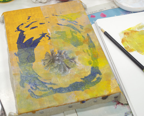 生徒によるテンペラ画、制作途中の様子