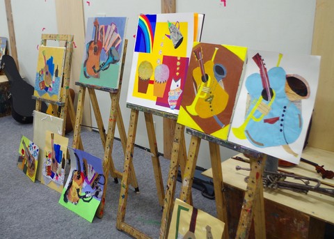 絵の具は使用せず、様々な紙を絵の具に見立てて絵画を作ります。色のついた紙は絵の具のベタ塗りを表せますし、模様のある紙(千代紙や包装紙などでOK)は、模様が絵のマチエールになります。