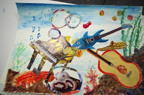 遊馬先生クラスで行われたコラージュ授業の様子。雑誌を切り抜きを使ったコラージュです。魅力的ですね。