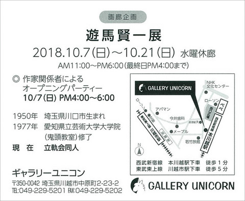 【展覧会情報】遊馬賢一 個展(ギャラリーユニコン/川越) 2018年9月16日 講師の遊馬賢一先生の個展が開催されます。是非ご高覧下さい。遊馬賢一展会 期:2018年10月7日(日)〜10月21日(日)時 間:11:00〜18:00(最終日16:00まで/水曜休廊)会 場:GALLERY UNICORN(ギャラリーユニコン) 〒350-0042 埼玉県川越市中原町2−23−2T E L:049−229−5201