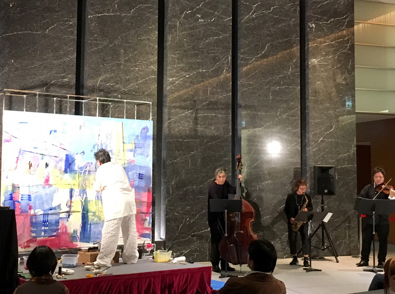ヴァイオリン(佐久間 大和さん)、コントラバス(河崎 純さん)、サクソフォン(日高和子さん)の生演奏をバックに出射先生が150号の作品を描きました。仕上がった大作にはガンダムが登場しています。