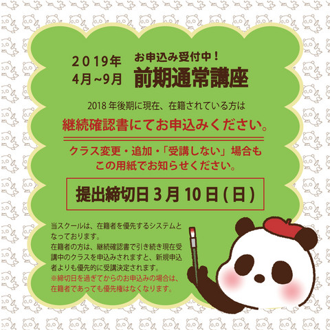 なお、現在通常講座へ在籍している受講生のみなさまは、助手がお配りしております「2019年前期講座 確認書」にてお申し込みくださいますようよろしくお願いいたします!
