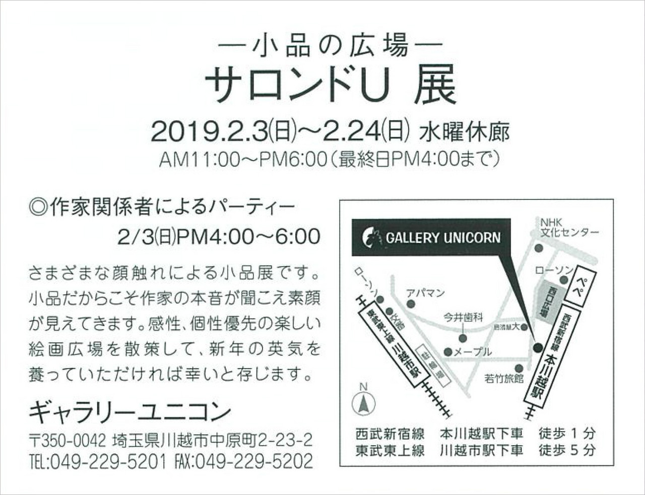 【展覧会情報】遊馬賢一 布袋孝雄 グループ展『サロンドU展』(ギャラリーユニコン/川越)