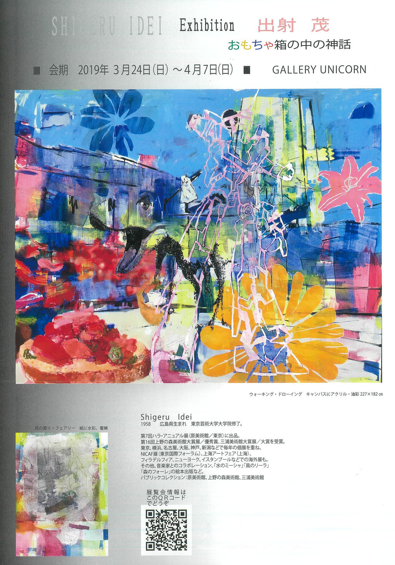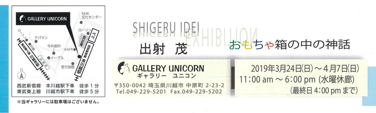 【展覧会情報】出射茂 個展(ギャラリーユニコン/川越) 2019年3月20日 講師出射茂先生の個展のご案内です。ぜひご高覧ください。「出射茂個展〜おもちゃ箱の中の神話〜」会期:2019年3月24日(日)~4月7日(日)時間:11:00~18:00(最終日16:00迄) ※水曜休廊会場:ギャラリーユニコン 〒350-042川越市中原町2-23-2 Tel.049-229-5201会期中のおもてなし:桜茶の会3月30日(土)、31日(日) 正午〜15時