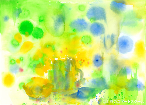 このにじみによって、思ってもみないカタチが生まれ、自ずと画面全体を触ることになります。眼の前にあるモチーフを意識しないで、水と絵具の動きを楽しんで背景からはじめてみましょう。このリラックスした進め方で、最後まで楽しく描き続けることができますよ。