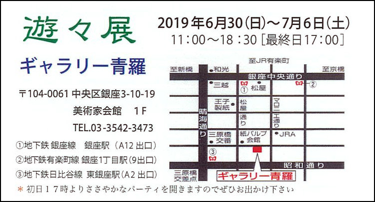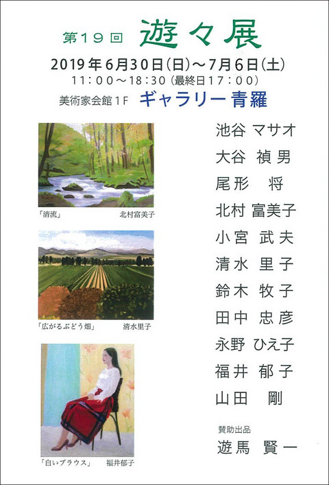 【展覧会情報】遊馬賢一 グループ展『第19回 遊々展』(ギャラリー青羅/銀座) 2019年6月22日 講師の遊馬先生が出品される展覧会をご案内いたします。遊馬先生がご担当されております、日曜クラスの作品展です。ぜひご高覧ください。「第19回 遊々展」2019年6月30日(日)〜7月6日(土)11:00~18:30(最終日は17:00まで)ギャラリー青羅〒104-0061 中央区銀座3丁目10−19美術家会館1FTel.03-3542-3473